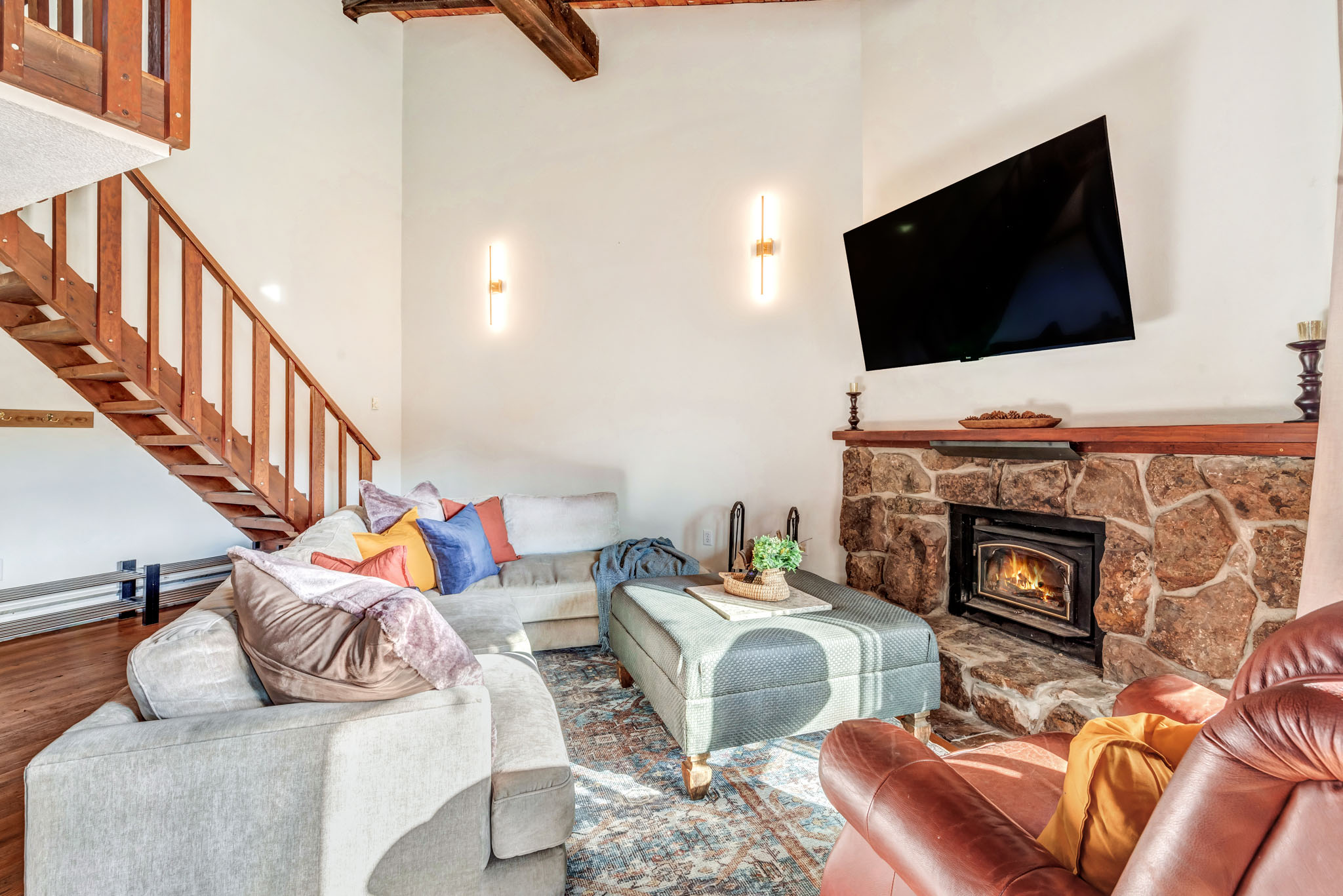 Wood burning fireplace: Cozy up by the wood-burning fireplace at Ski Town Chalet and enjoy the warm ambiance and crackling flames after a day of adventure. Perfect for relaxing with loved ones and creating lasting memories in the heart of the mountains.